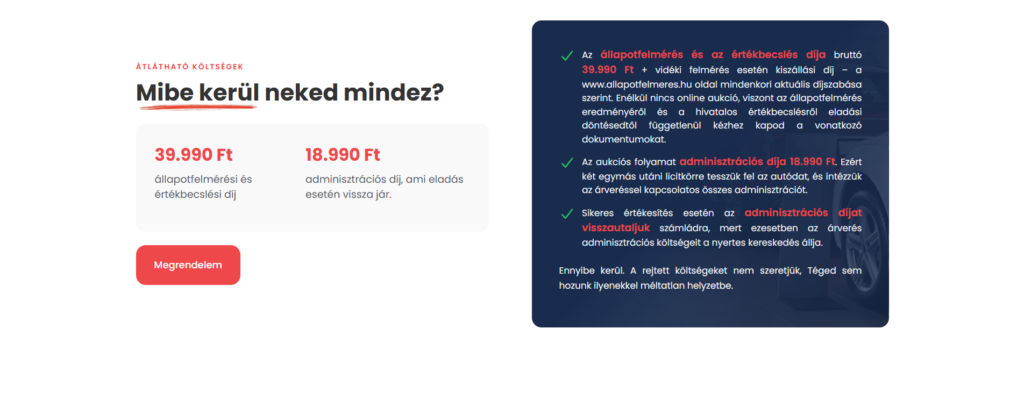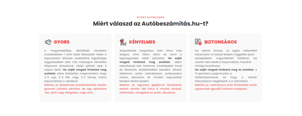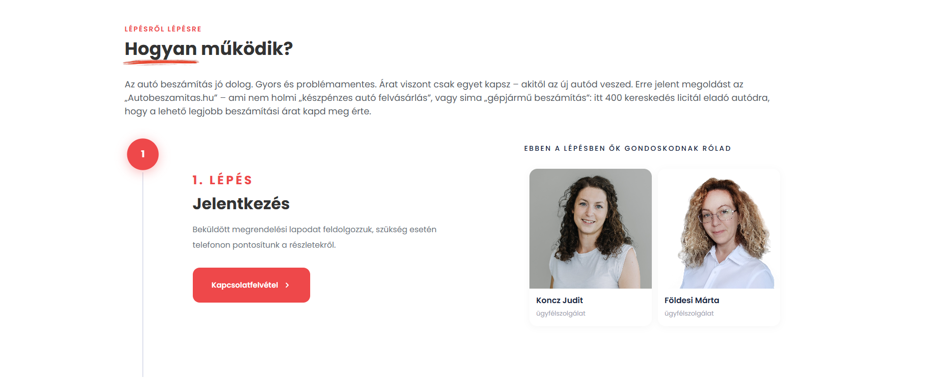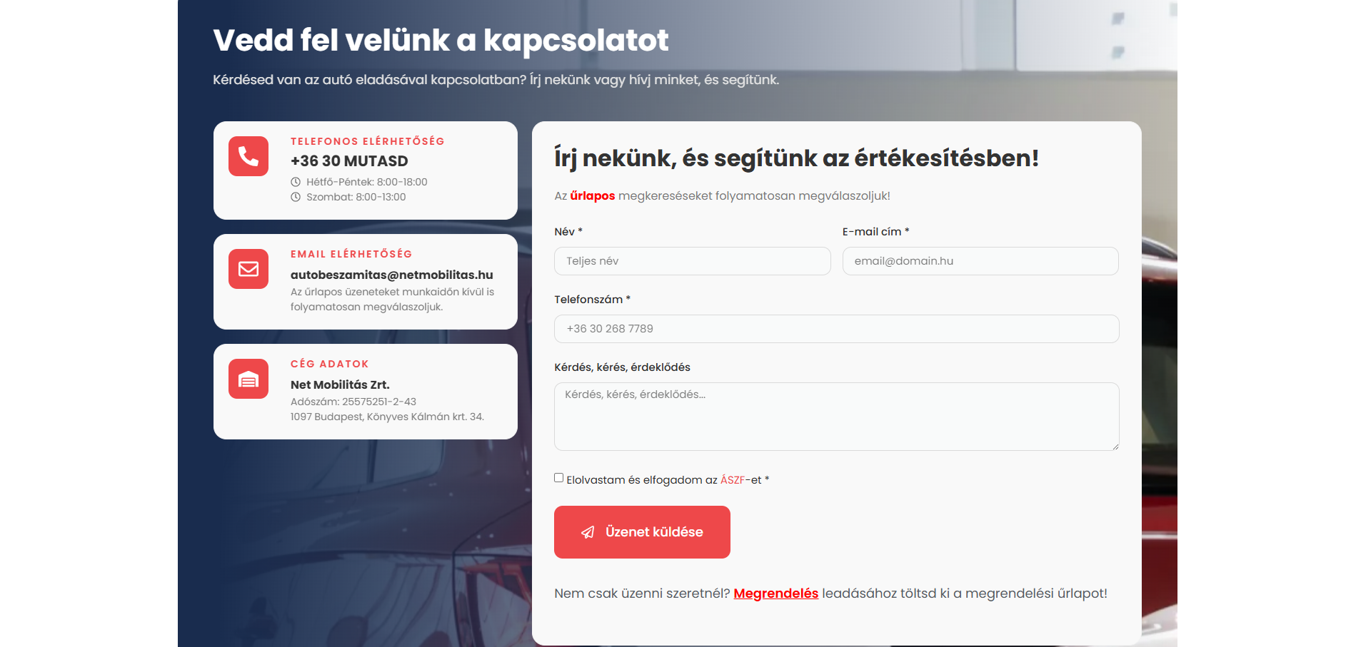 Az oldal felépítése logikus és felhasználóbarát: a látogatók könnyedén eligazodnak az autóbeszámítás folyamatában, az ajánlatkérés lépéseiben, valamint a szolgáltatás előnyeiben. A hangsúly a gyors kapcsolatteremtésen és az egyszerű ügyintézésen van, amely minimalizálja az autócsere idő- és energiaigényét.
