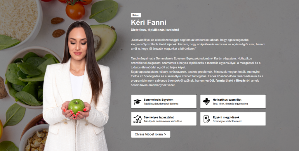Az oldal logikus, felhasználóbarát struktúrával rendelkezik, amely lehetővé teszi, hogy a látogatók könnyedén eligazodjanak a tanácsadási szolgáltatások, az étrendkészítés, valamint az életmódváltást támogató programok között. Emellett hangsúlyt kap a hiteles, közérthető kommunikáció, amely segíti a tudatos döntéshozatalt és az egészséges szokások kialakítását.