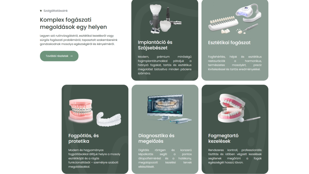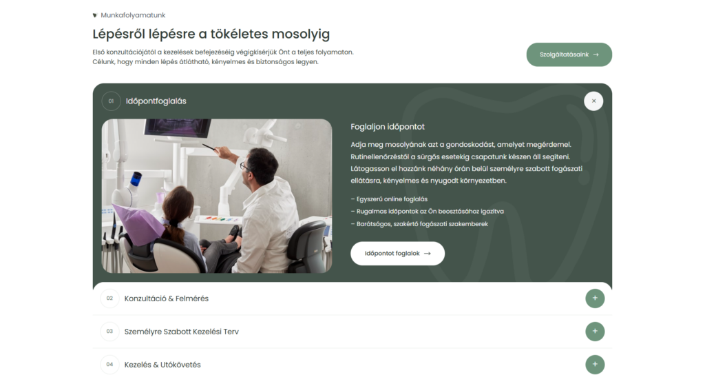 Az oldal logikus, felhasználóbarát felépítése segíti a látogatókat abban, hogy könnyedén eligazodjanak a fogászati kezelések (általános fogászat, esztétikai beavatkozások, implantológia), a kezelési folyamatok, valamint a kapcsolatfelvétel és időpontfoglalás lehetőségei között. A hangsúly a közérthető kommunikáción, a bizalomépítésen és a páciensek kényelmén van.